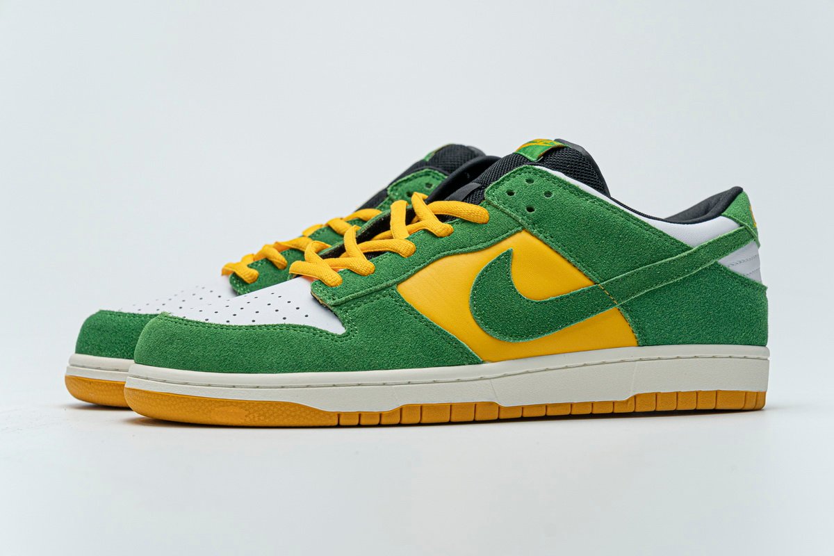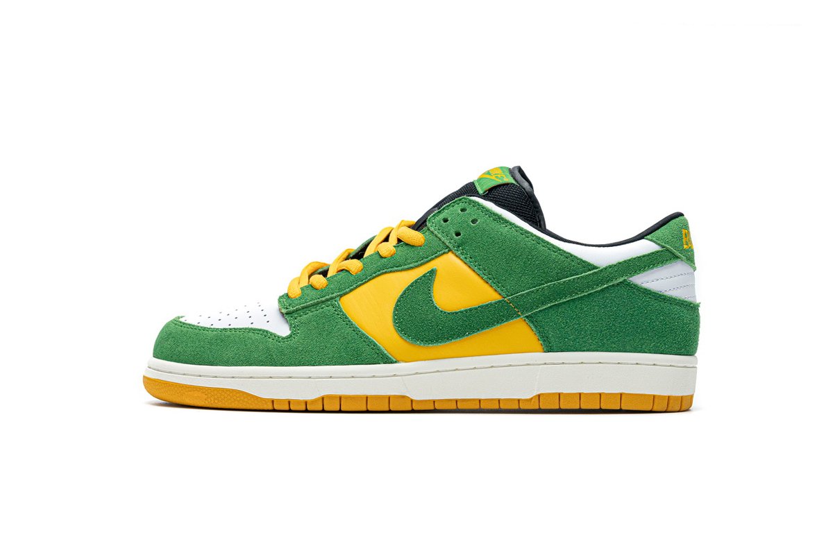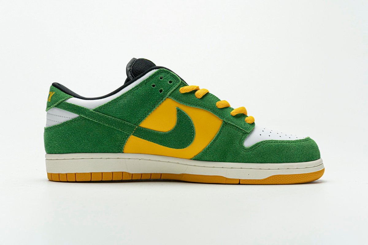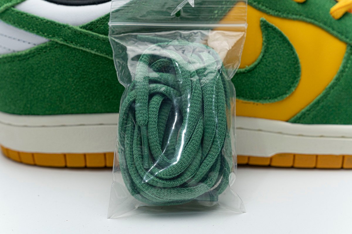 Nike Dunk Low Green Yellow 804292-132 feels just like Brazil. The tongue is stitched in green and yellow, the nike logo is in yellow font, the laces are equipped with green and yellow laces, the shoe is connected in two colors, the bottom is brownish, and the top is white rubber bottom.